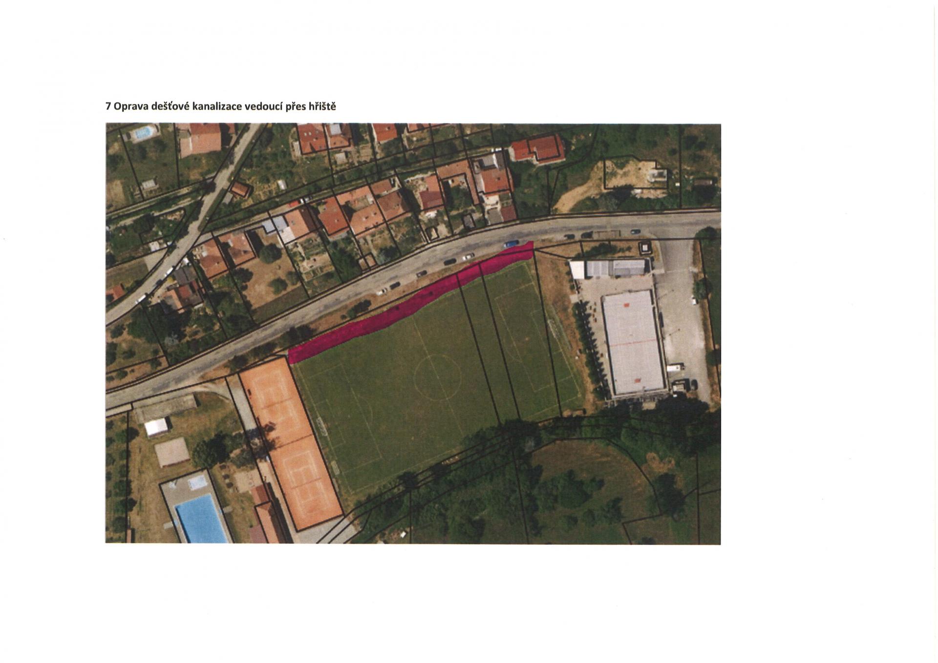 oprava dešťové kanalizace vedoucí krajem fotbalového hřiště |