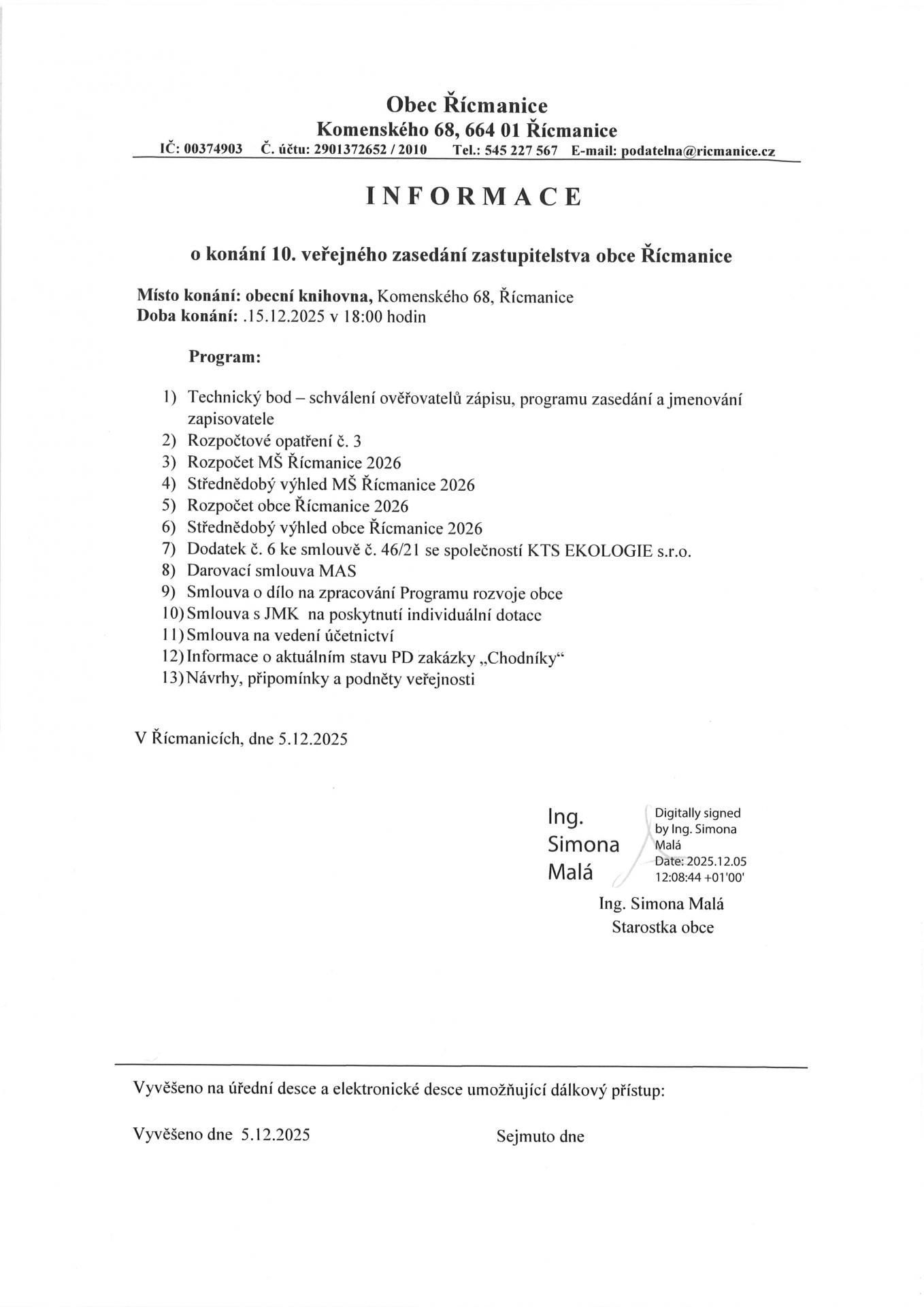 10. veřejné zasedání zastupitelstva obce Řícmanice